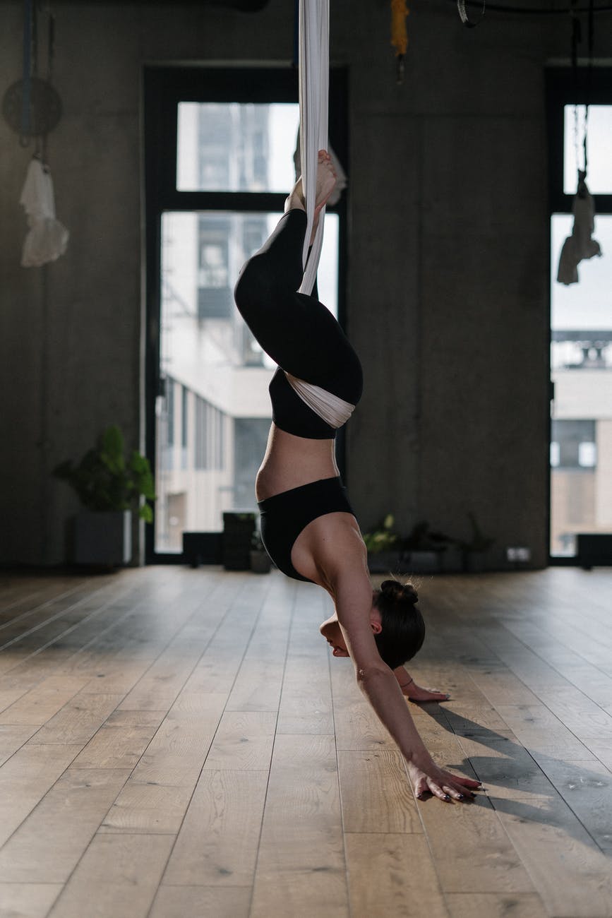 woman in black sports bra and black panty bending her body